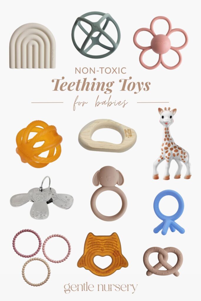So what materials are safest? Natural rubber, silicone, cotton, and natural wood teethers are the best, safest choices for your baby’s teething toys. Note that rubber and silicone teething toys can also be thrown in the freezer for some quick, cold relief. Some of my favorite teething toys are available here on my Amazon shop.