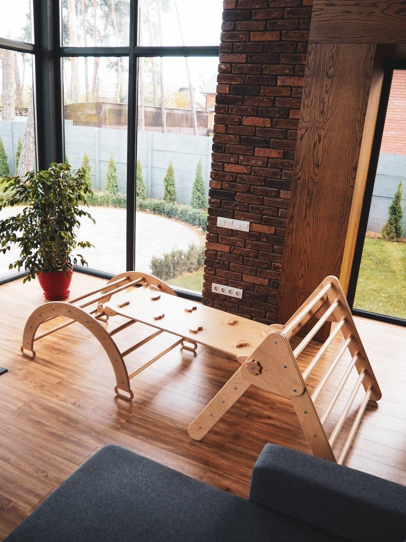 Some creators add slides, ramps, and bridges to their Pikler triangles. These are a great way to allow your child to use their muscles and stay entertained inside. It’s also a great precursor to the big outdoor swingset that kids play on, along with slides and swings.